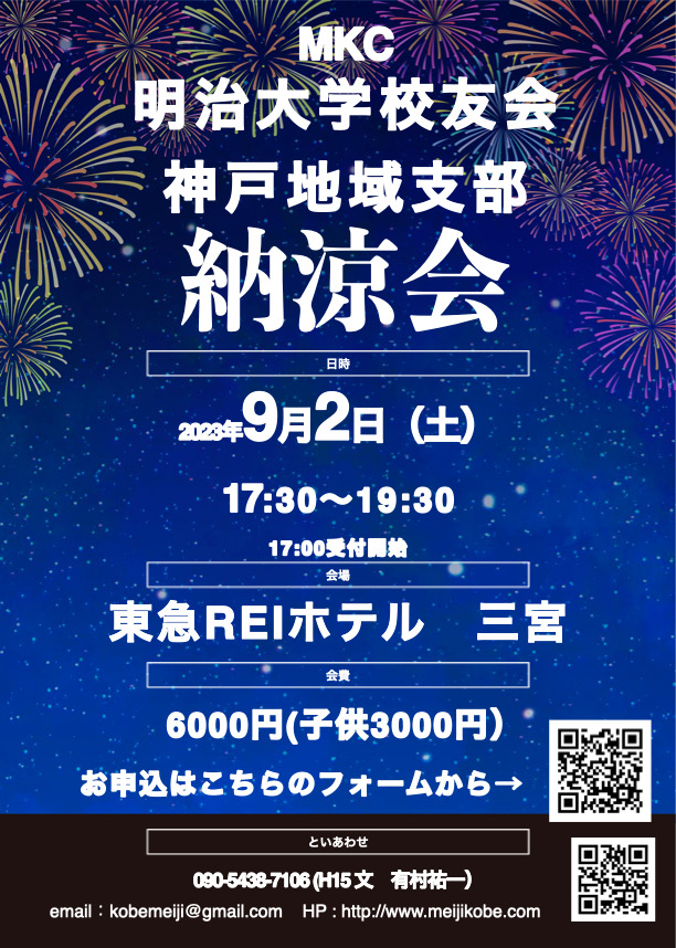2023年7月15日 / 最終更新日時 : 2023年7月31日 meijikobe_admin イベント・最新情報 2023年9月2日(土曜日)開催:「2023年納涼会」について 2023年納涼会2023年9月2日(土曜日)東急REIホテル3階 宴会場 Google Mapはこちらをクリック *企画内容など詳細決定次第ご報告します。 【お申込みについて】 お申込みはこちらをクリック